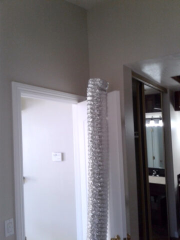 Because this property was a townhouse and because townhouses (condos) often share walls with neighboring units between which air flows freely we used plastic sheeting and non-stick blue masking tape to keep the ozone from traveling to areas that we don’t want to impact, the like their neighbors.